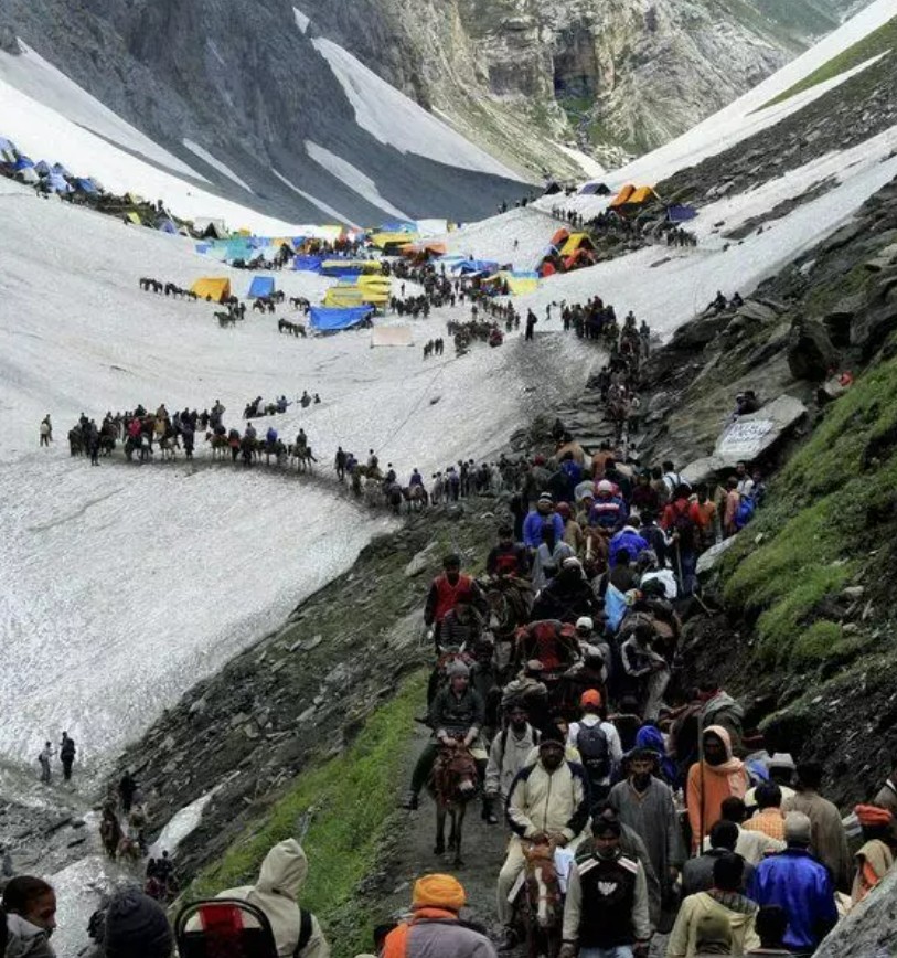 Capture the adventurous journey to Amarnath, where devotees and trekkers embark on a challenging trek through the rugged terrain, glaciers, and high-altitude paths to reach the holy cave